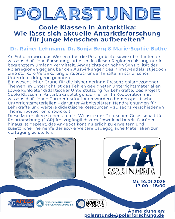Hiermit sind Sie herzlich zur nächsten Polarstunde am 14. Januar 2026, 17:00 Uhr eingeladen, die wieder im Online-Format (per Zoom) stattfinden wird. Thema dieser Polarstunde ist: